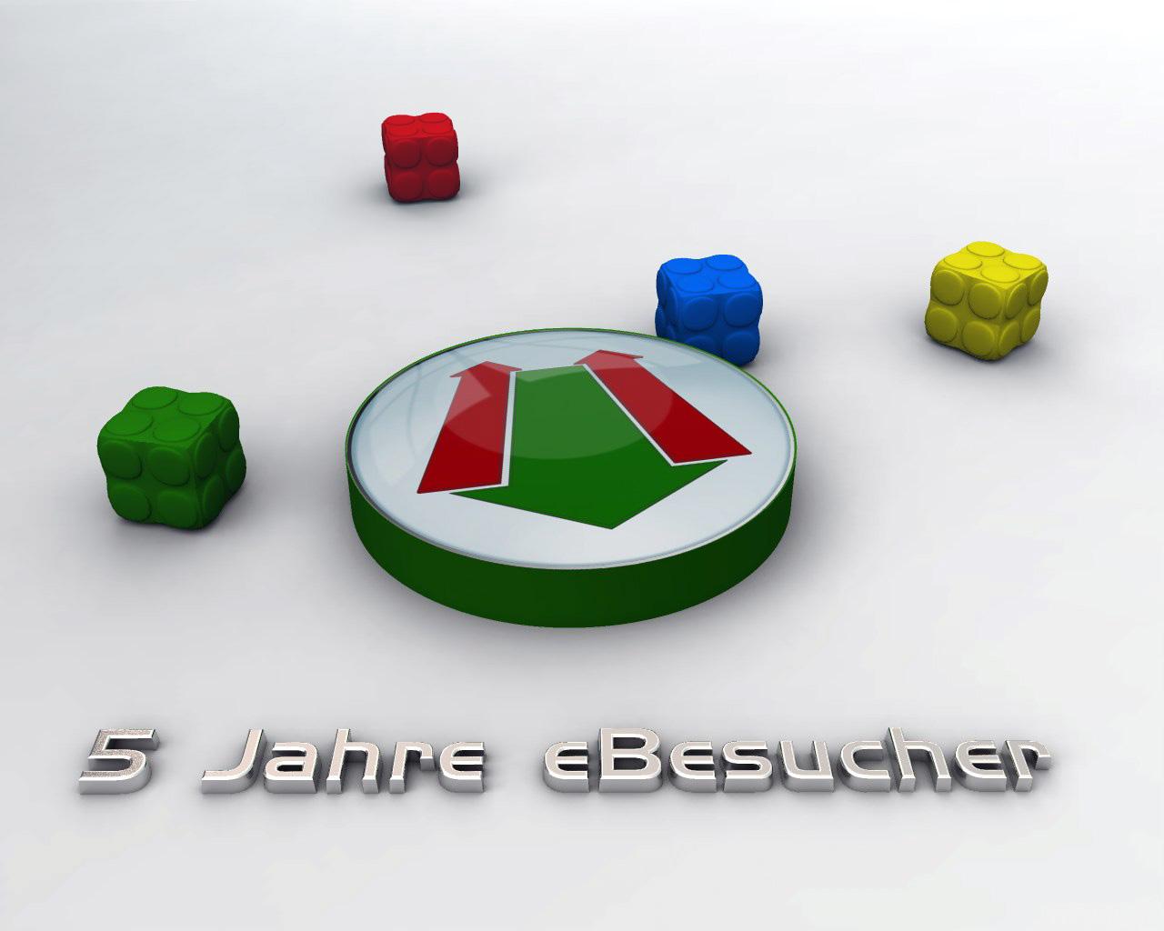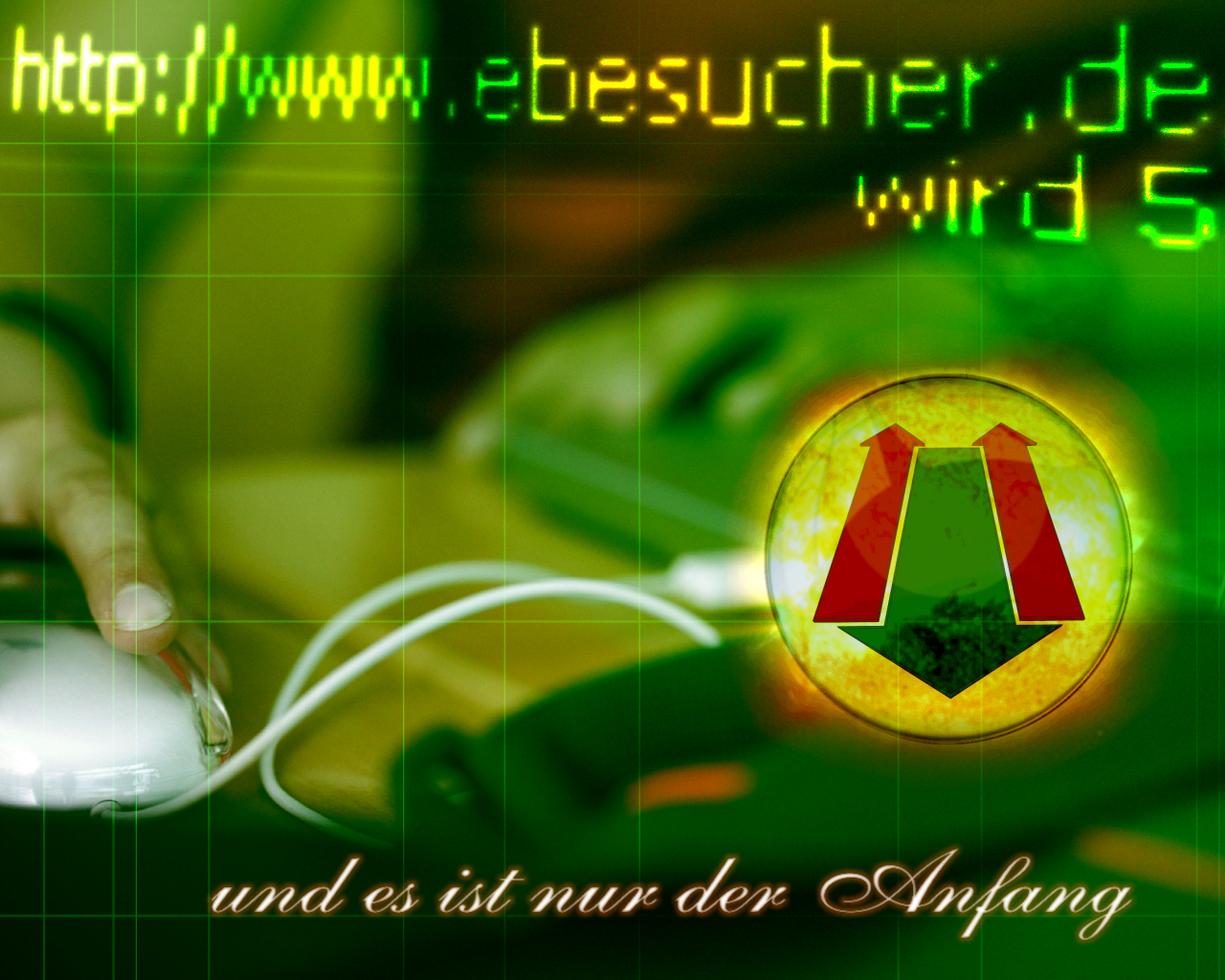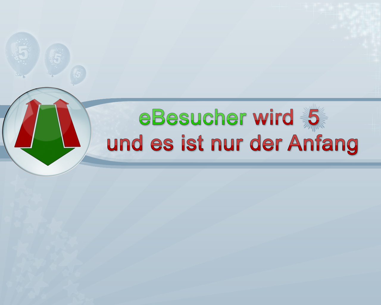 Heute, am 24. Oktober 2007 wird eBesucher 5 Jahre alt! Zu diesem Anlass hat eBesucher seine Mitglieder aufgefordert, ein Wallpaper zum Thema "eBesucher wird 5 - und es ist nur der Anfang" zu erstellen und einzusenden. Wir möchten an dieser Stelle allen Mitgliedern, die sich an diesem Wettbewerb beteiligt haben, herzlich für die zahlreichen Einsendungen danken! Die Wahl der besten 5 Einsendungen ist unserem Team nicht leicht gefallen.