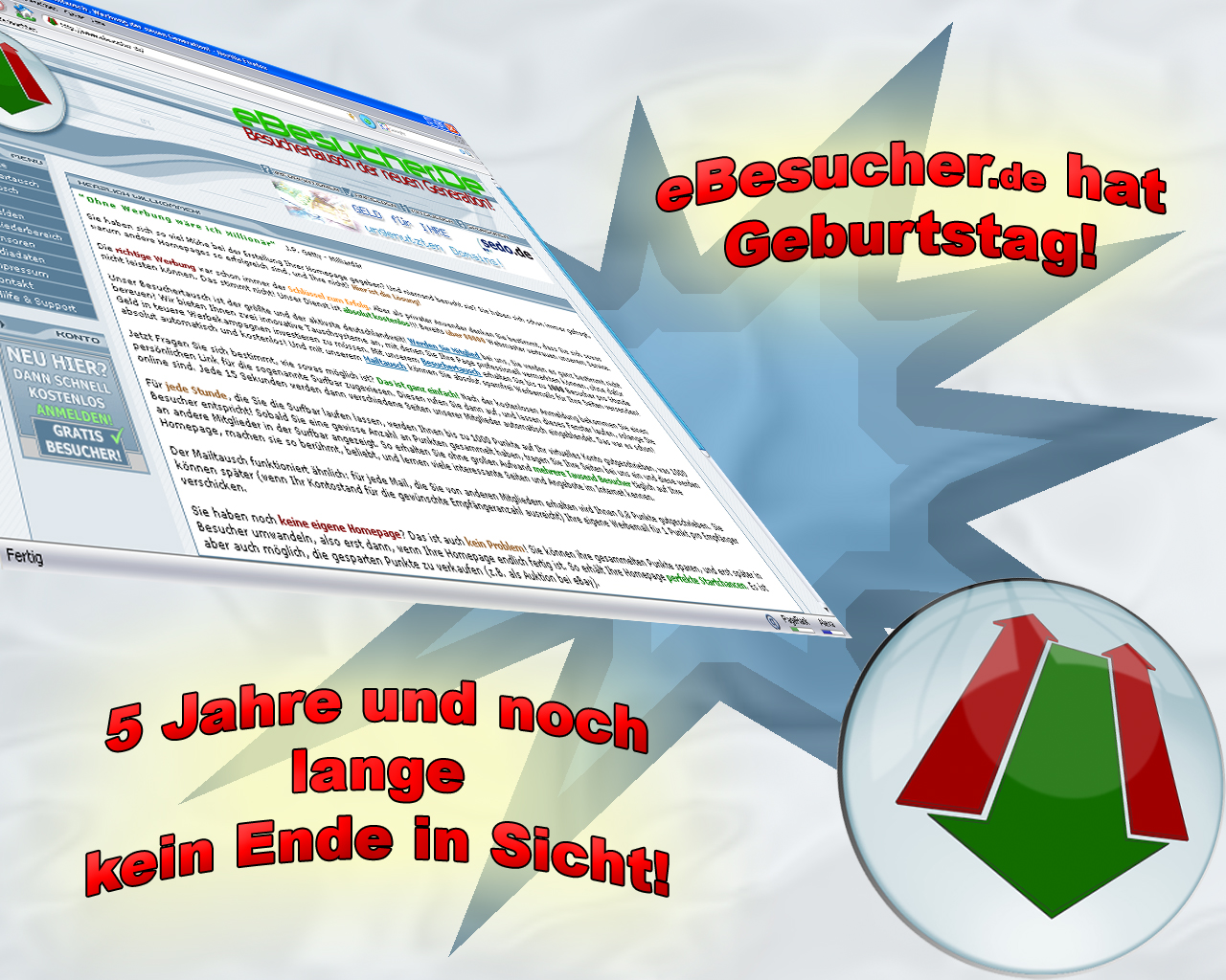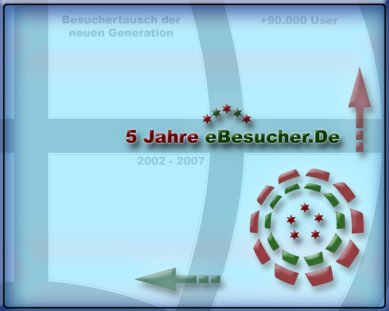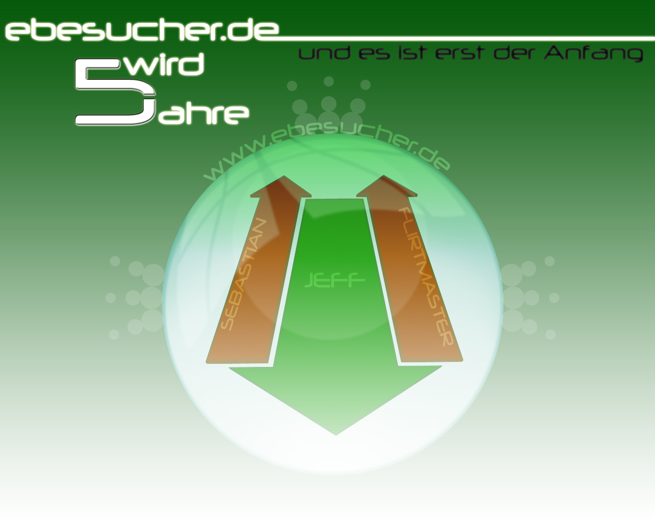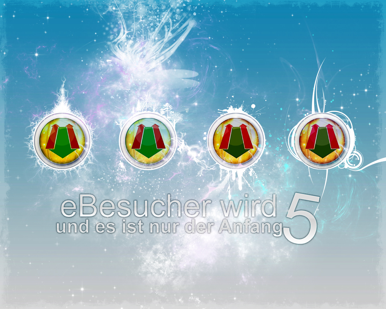 Heute, am 24. Oktober 2007 wird eBesucher 5 Jahre alt! Zu diesem Anlass hat eBesucher seine Mitglieder aufgefordert, ein Wallpaper zum Thema "eBesucher wird 5 - und es ist nur der Anfang" zu erstellen und einzusenden. Wir möchten an dieser Stelle allen Mitgliedern, die sich an diesem Wettbewerb beteiligt haben, herzlich für die zahlreichen Einsendungen danken! Die Wahl der besten 5 Einsendungen ist unserem Team nicht leicht gefallen.